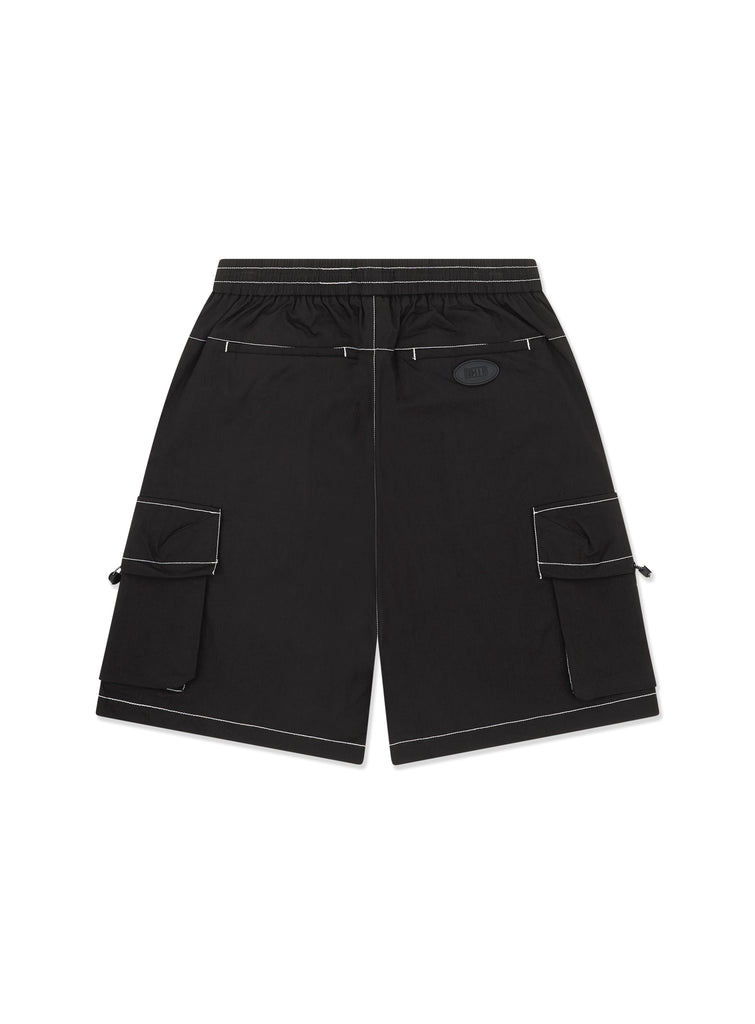 Front and rear pockets with side cargo pockets featuring elastic drawcord detail. Elastic waistband with adjustable drawcord. Size 32 fits with a 23" outseam.