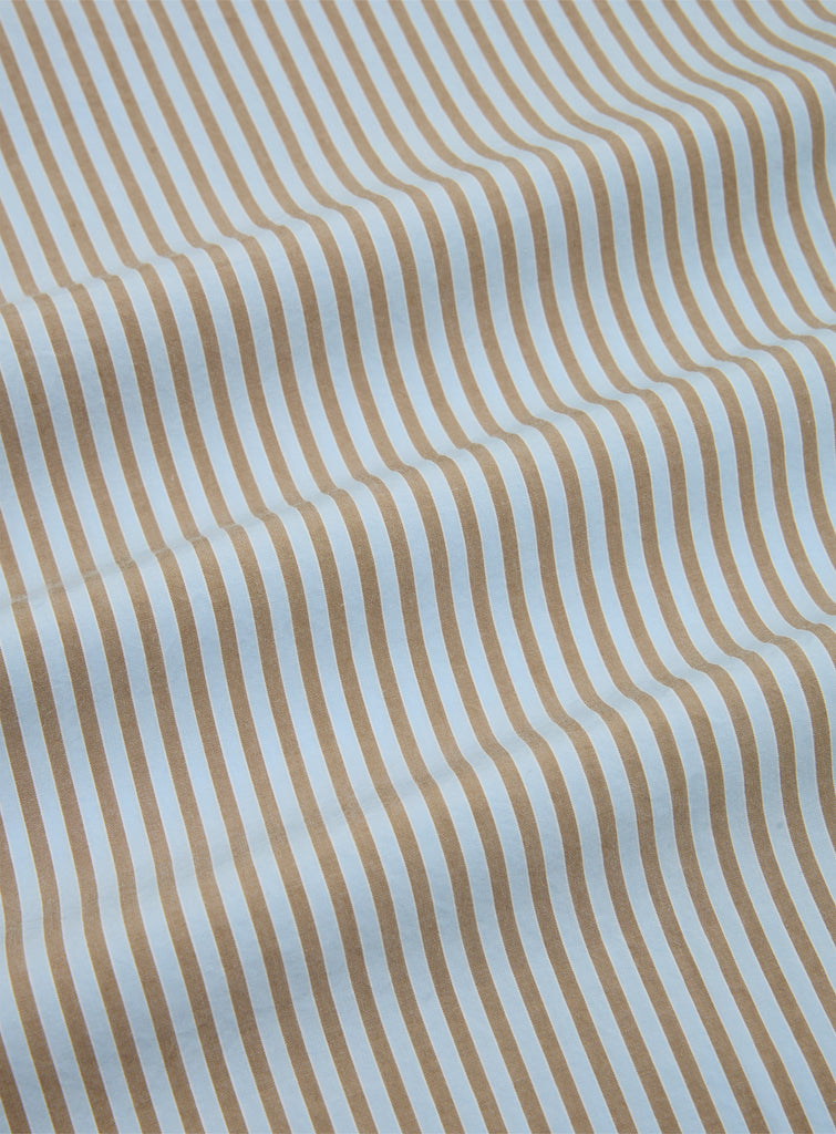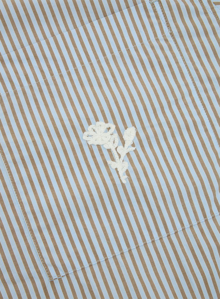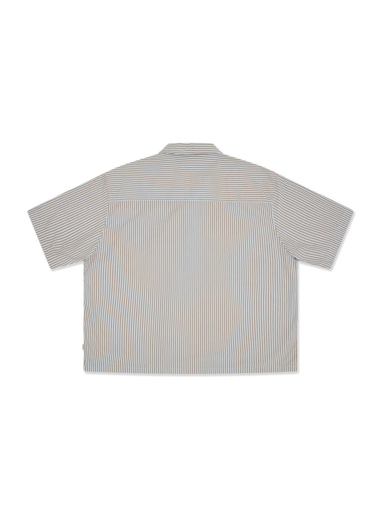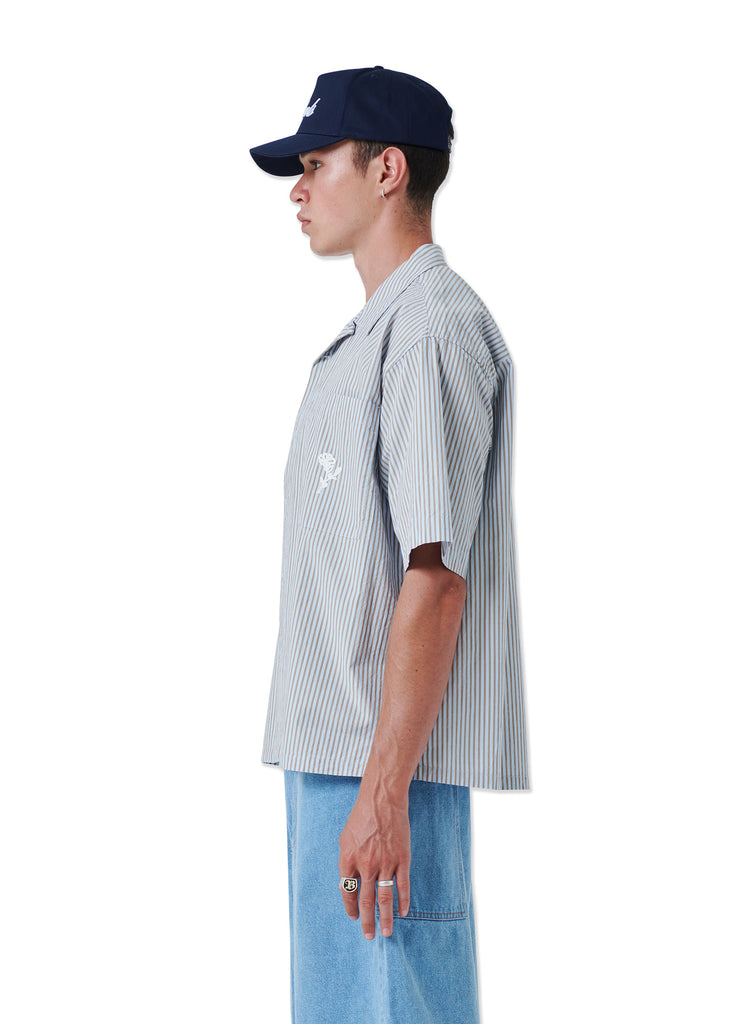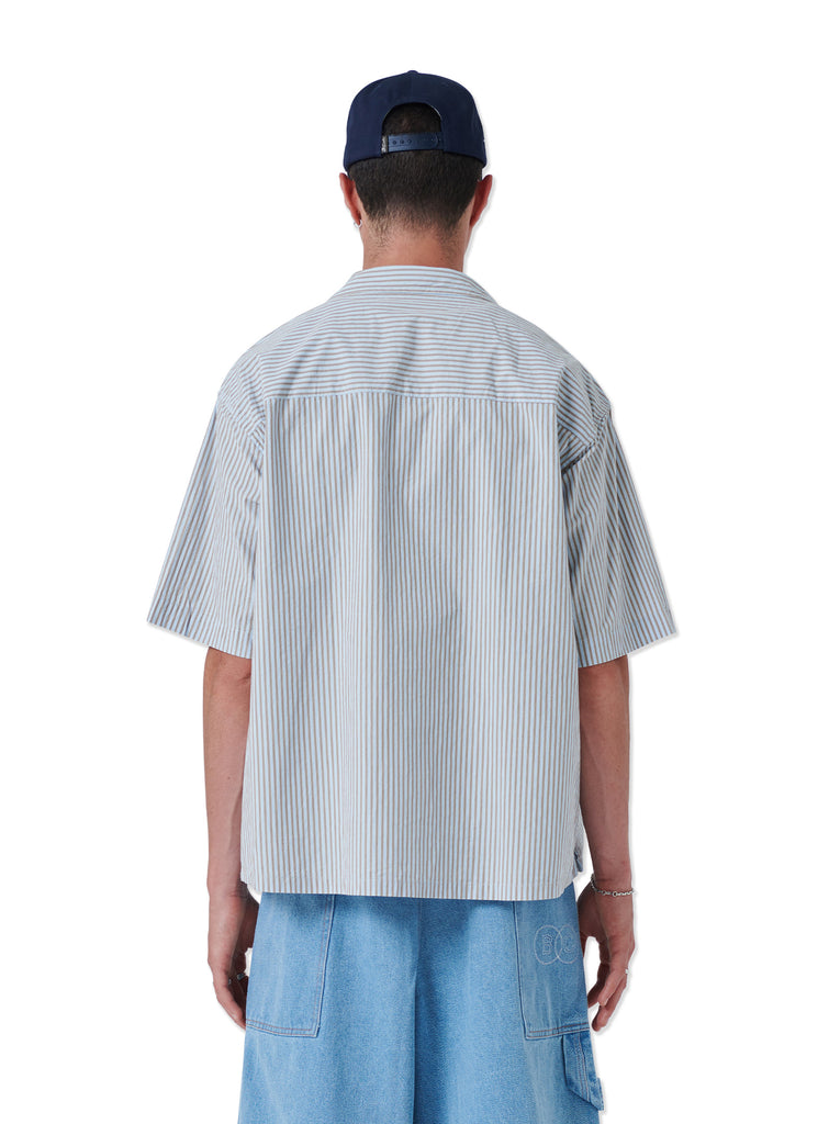 The Boathouse shirt in Blue. Stripe fabric with chest pocket embroidery. Boxy fit, shorter length with resort collar.