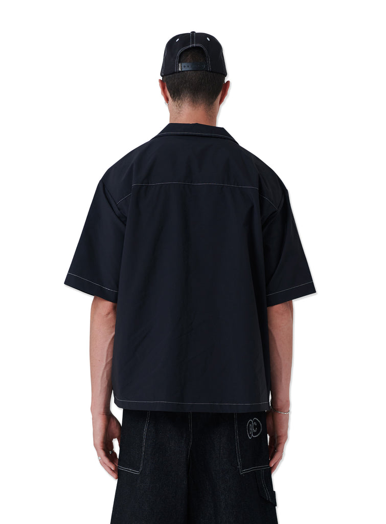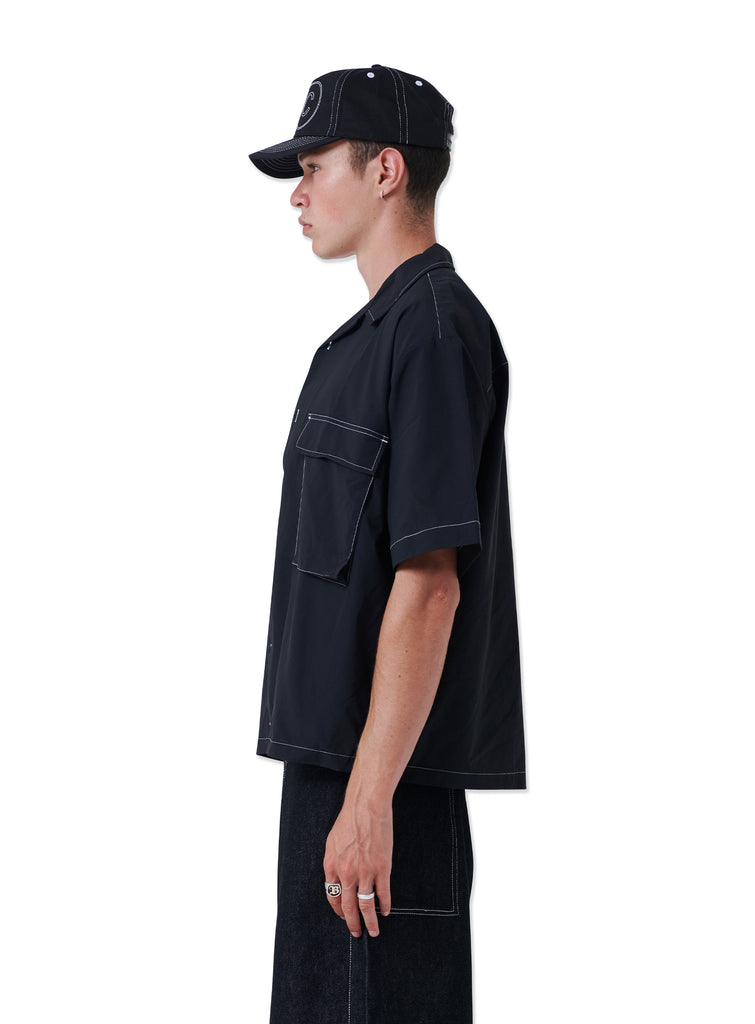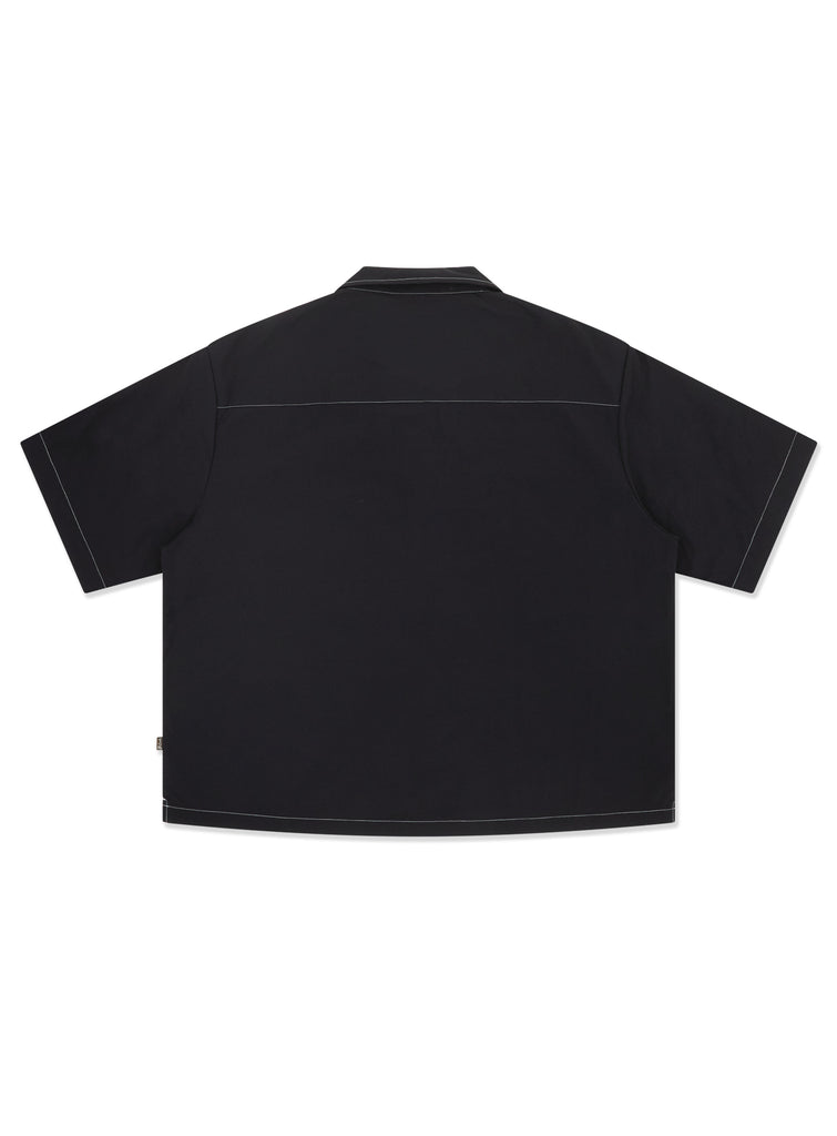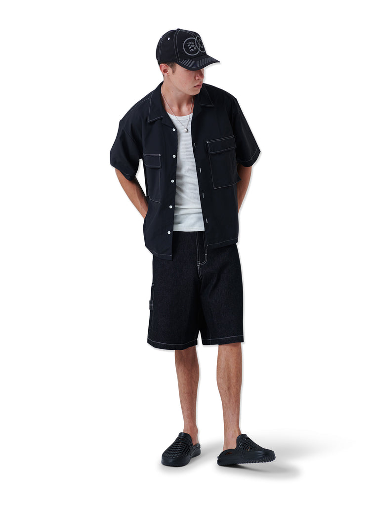 Boxy fit with a slightly cropped length. Finished with contrast stitching, a camp collar, and double chest pockets for a laid-back utility feel.