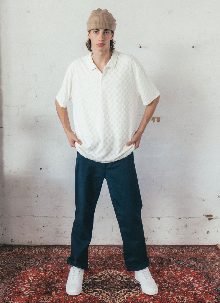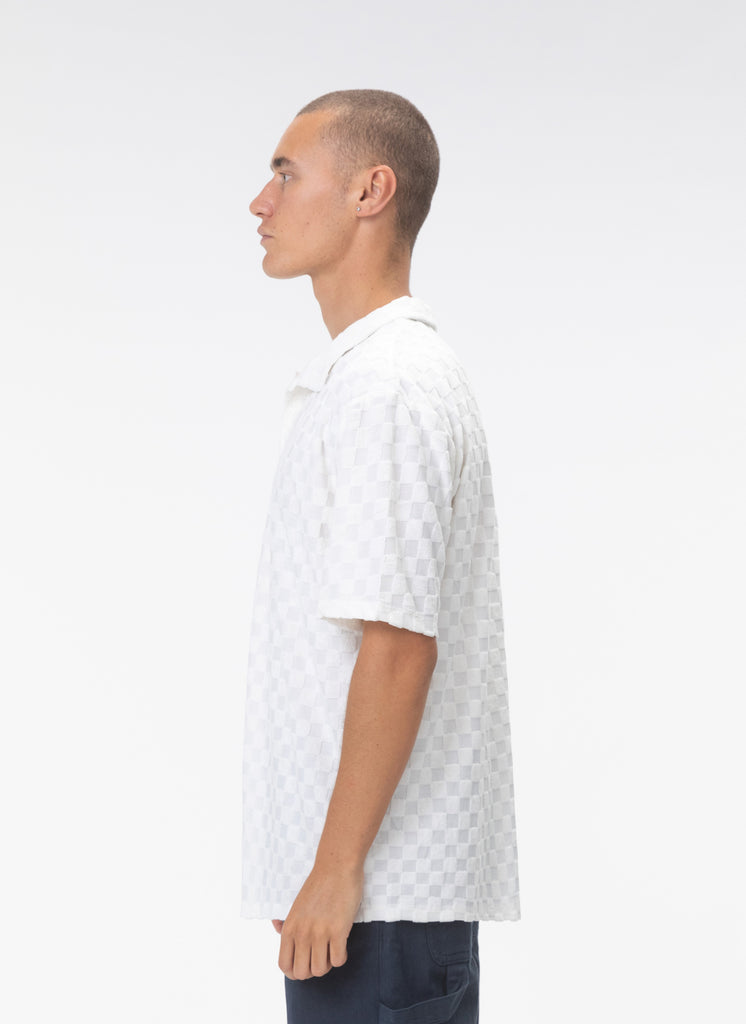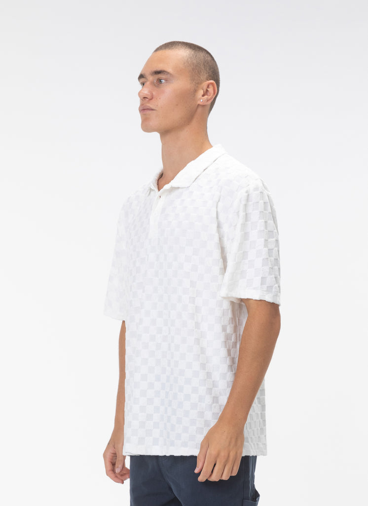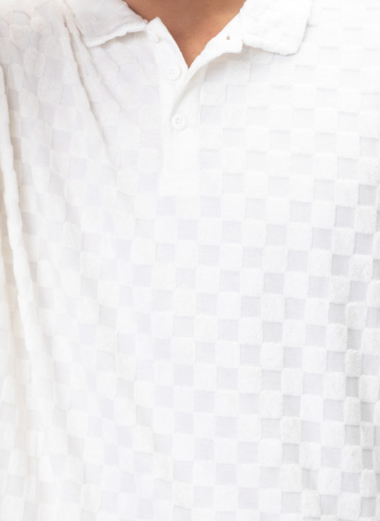The new party shirt is here to play in The Terry Checker Polo in White - constructed from breathable terry towelling fabric and features a neat checkerboard design, it's the ultimate sun-drenched selection.
