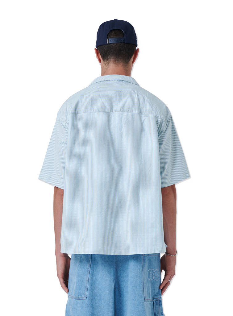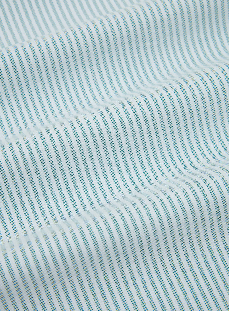 The Atlas Shirt. Green stripe oxford fabric with chest embroideries. Boxy fit, resort collar and shorter length.