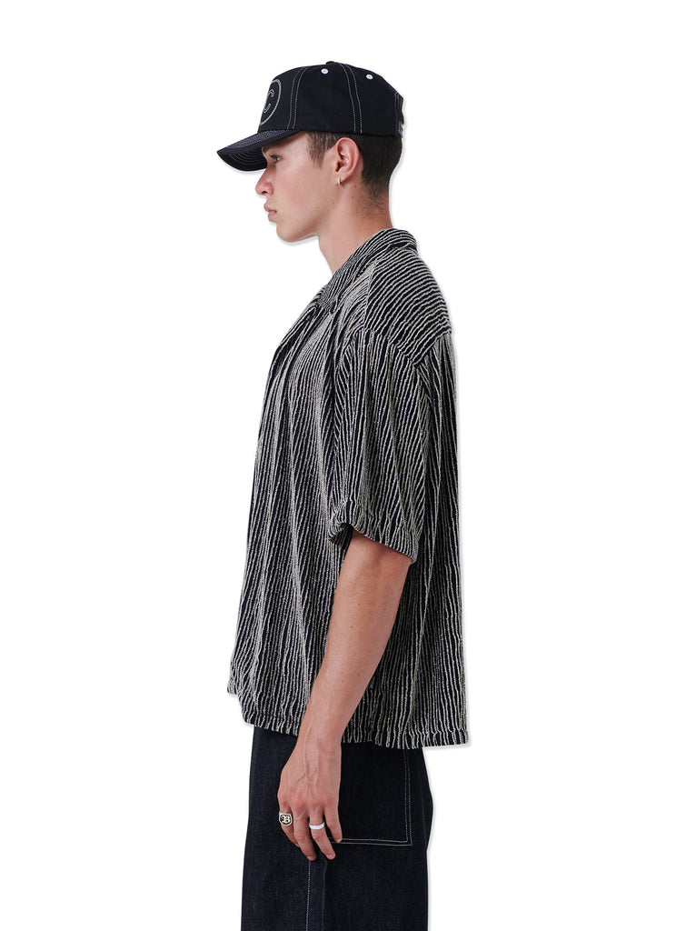 The Crop Shirt. Specialty textured fabric, resort collar and boxy fit. Length is shorter through body.