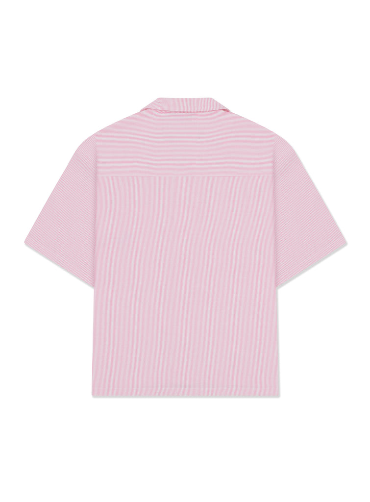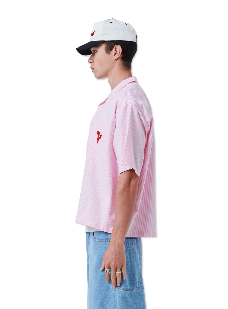 This boxy and cropped fit shirt is made on cotton oxford fabric, with woven micro pink stripe. Chest pocket features red floral artwork in chainstitch embroidery. Shirt has resort collar and light tortoise buttons.