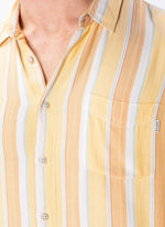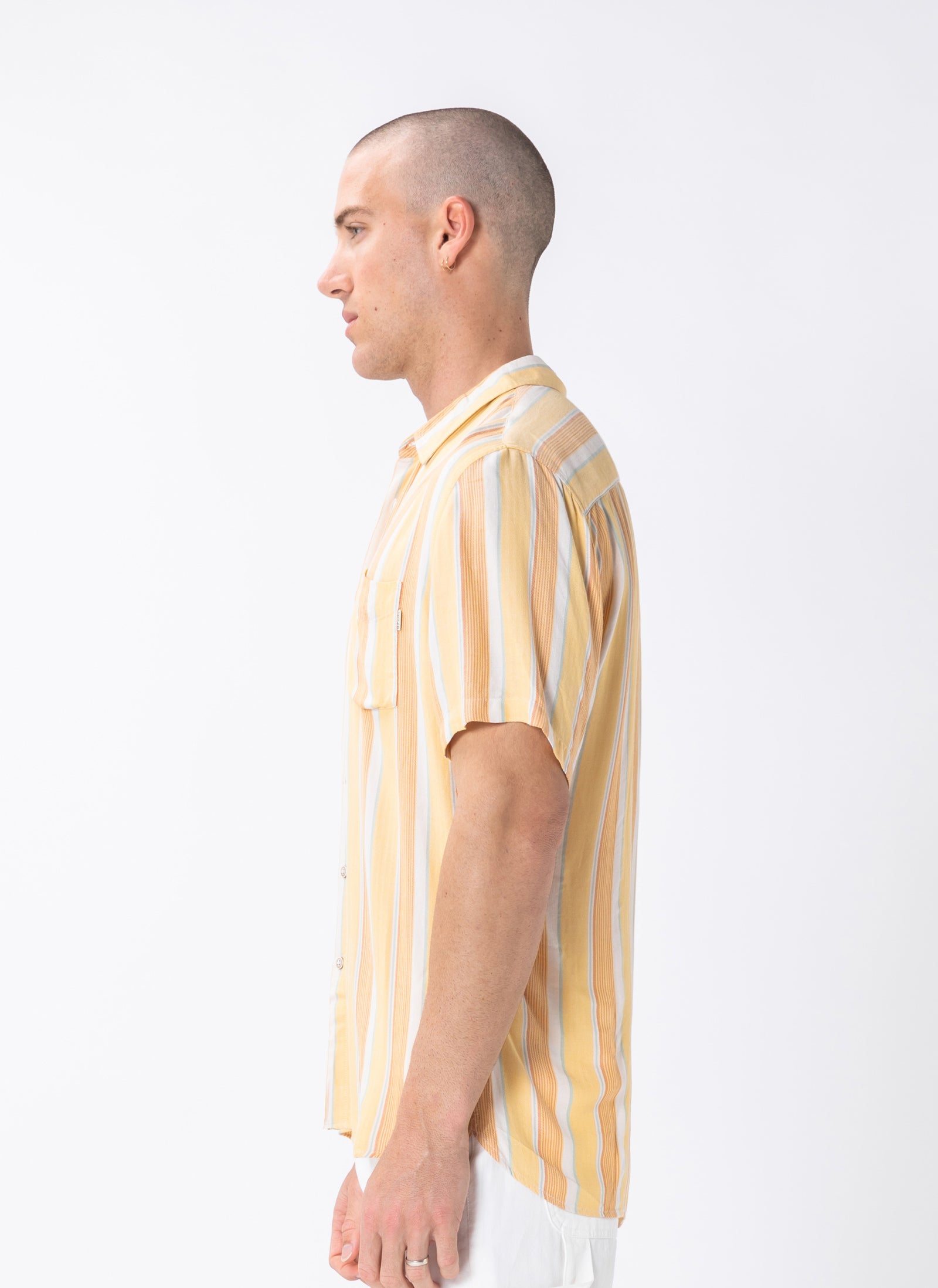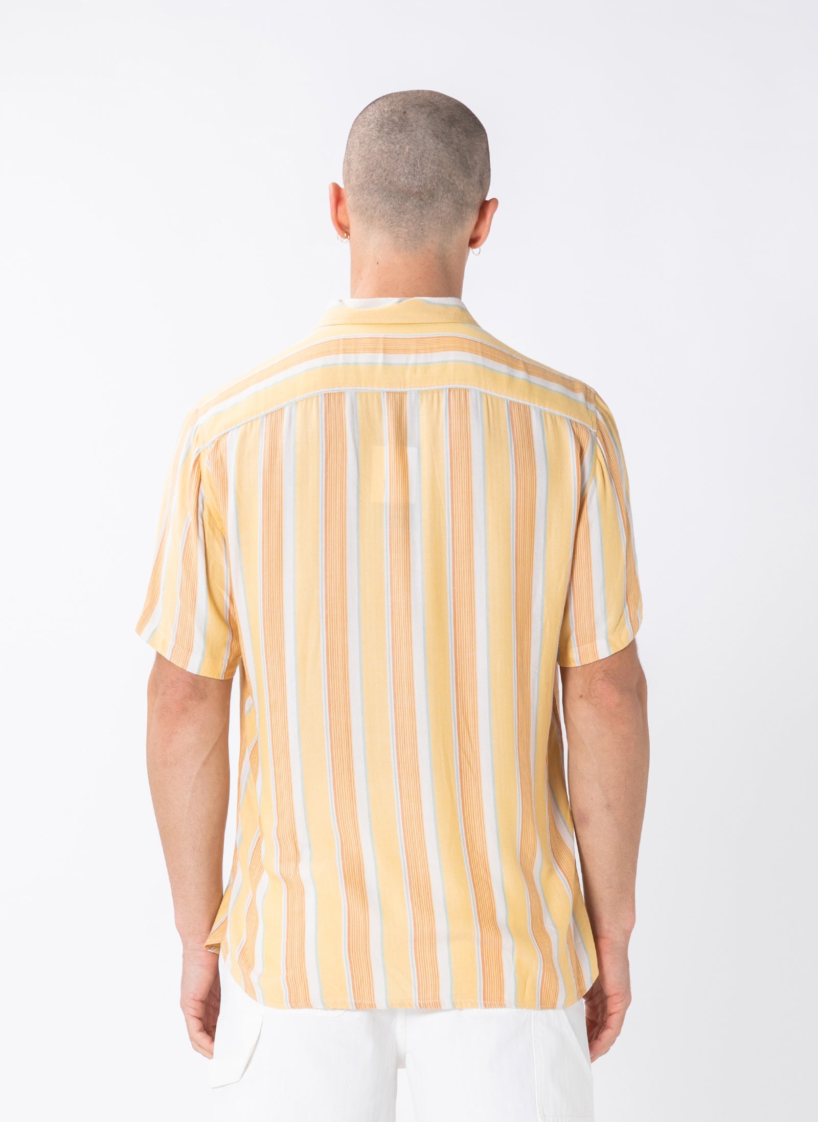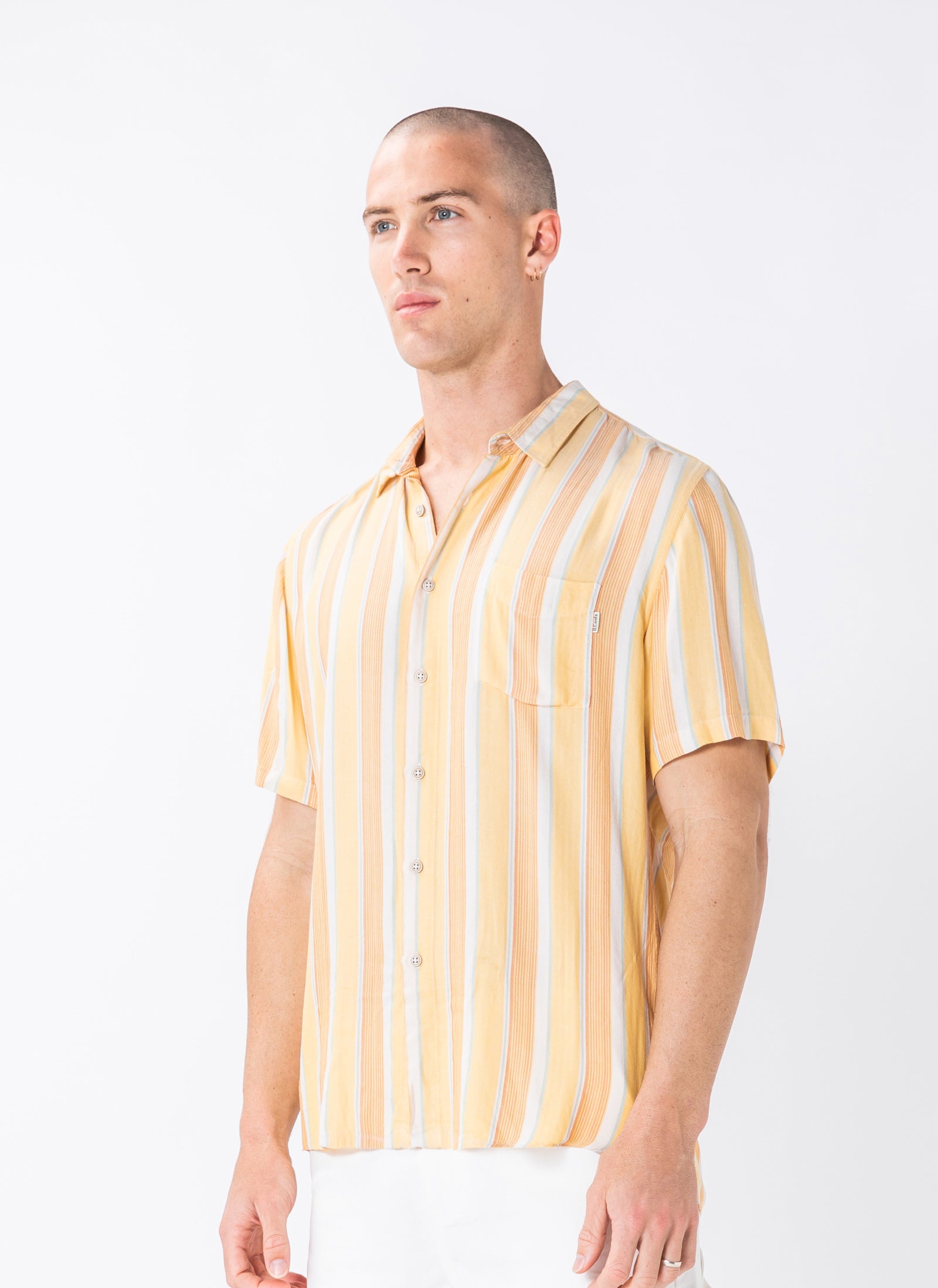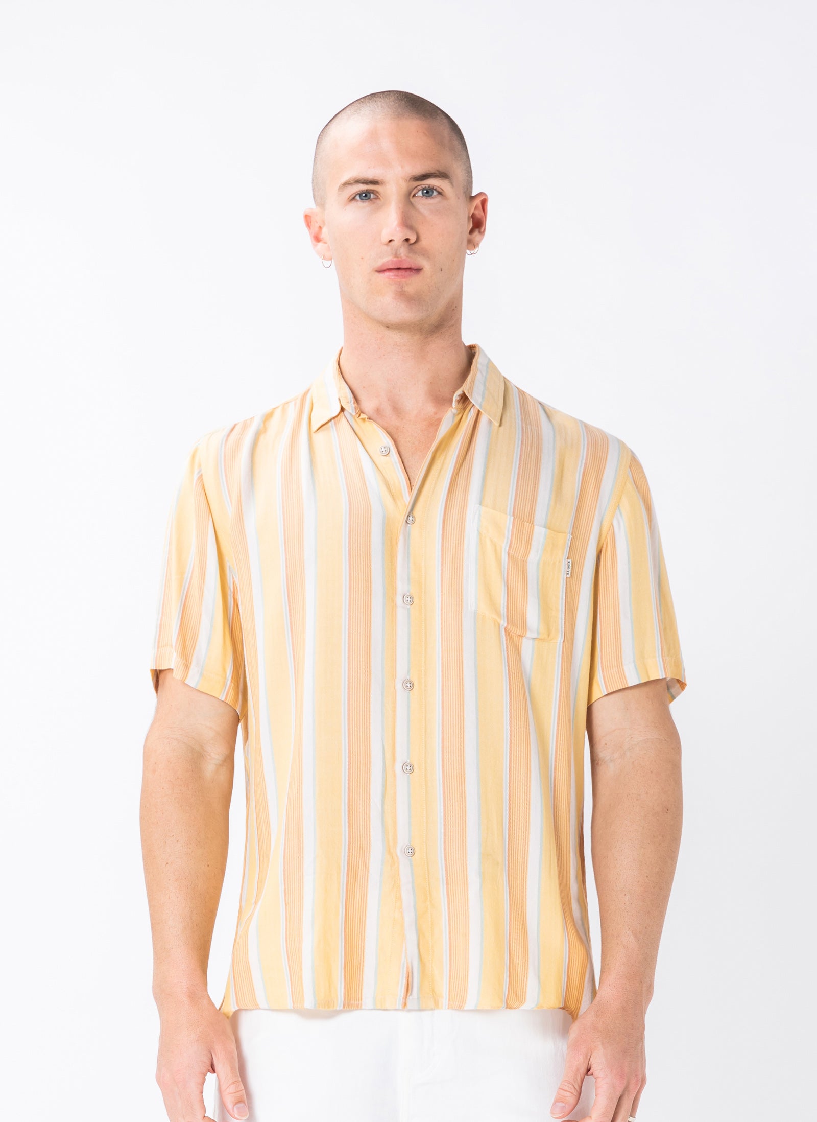 Spice up your summer staples with the Barney Cools Holiday Shirt in Amber Stripe. Our 100% recycled lightweight and supersoft rayon poplin shirt with a classic collar, chest pocket and button front.