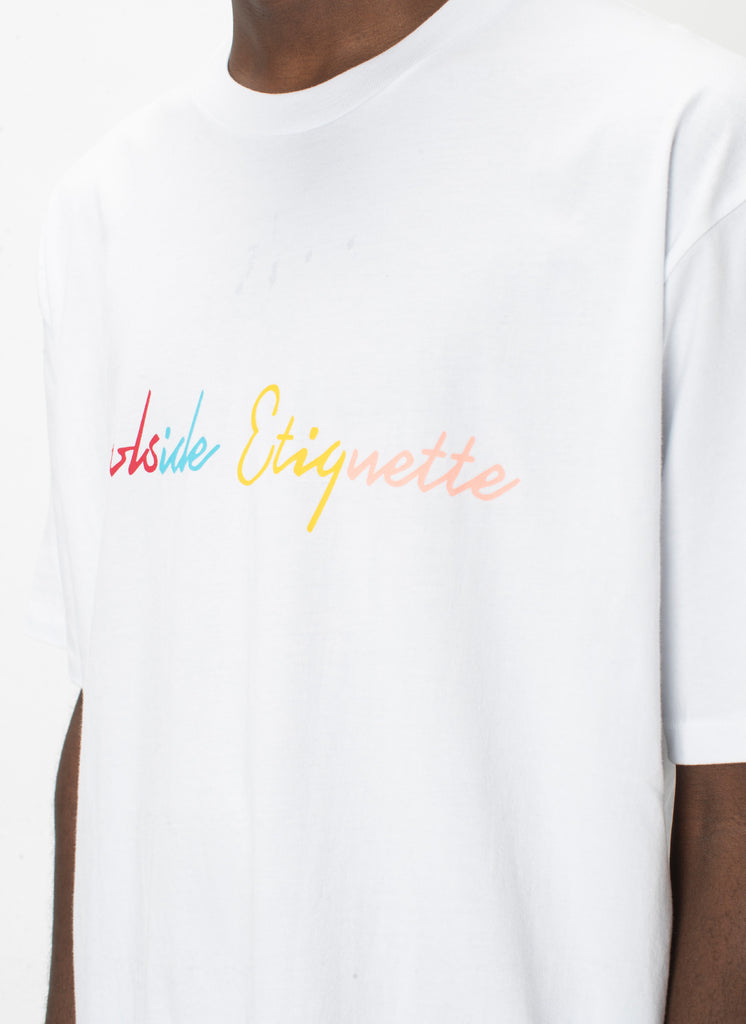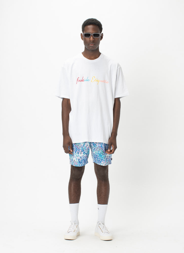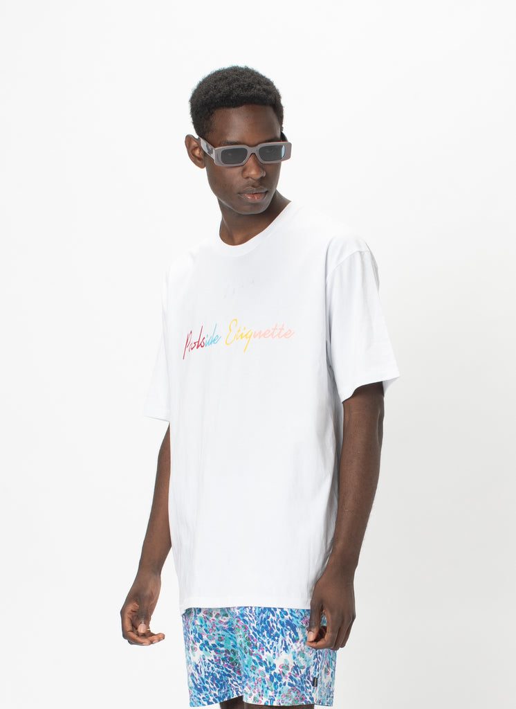 • Multi-coloured Poolside Etiquette typography logo on chest